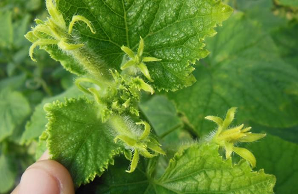(1)溫度異常時造成黃瓜花打頂現象的主要原因,在生長前期時,晝夜溫差較大,會使葉片白天制造的養(yǎng)分不能及時運輸到其他部位,導致葉片濃綠皺縮,提高老化,影響光合作用。而在低溫情況下種植生長受到抑制,生殖生長超過營養(yǎng)生長,造成花打頂現象。在種植時要注意溫度的變化,在白天高溫時,加強棚室通風,降低棚內溫度,而在晚上溫度較低時,封閉棚室,使棚內溫度升高,減少晝夜溫差。